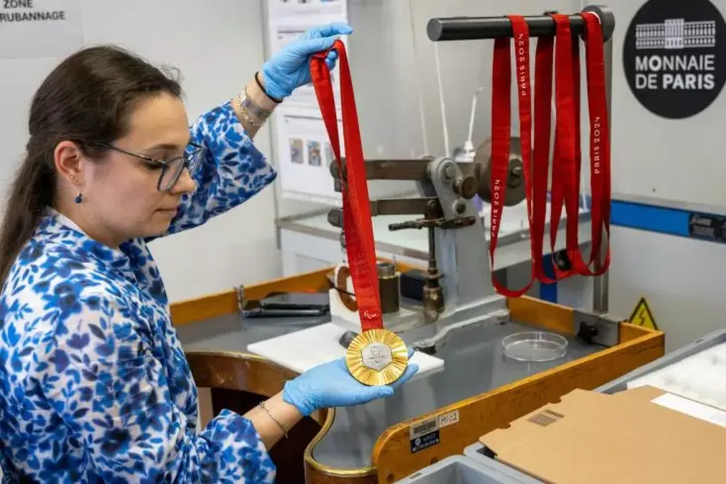 | Une employée tient une médaille d'or pour les Jeux olympiques et paralympiques de Paris avec un morceau hexagonal de métal issu de la tour Eiffel dans les ateliers de la Monnaie de Paris. |