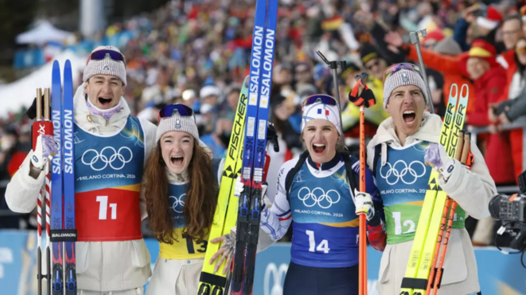 | (De gauche à droite) : Éric Perrot, Lou Jeanmonnot, Julia Simon et Quentin Fillon Maillet après leur titre sur le relais mixte des JO-2026, à Anterselva, en Italie, le 8 février. |
