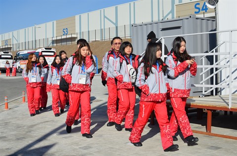 | Des volontaires sud-coréens des JO 2018 à Pyeongchang. |