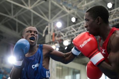 | Le Namibien Matias Hamunyela (droite) face au Comorien Fotsala Simplice lors d'un combat amateur mi-mouche, le 25 juin 2017 à Brazzaville. |