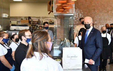 | Le président américain Joe Biden en visite à Taqueria Las Gemelas, restaurant de Washington, le 5 mai. |
