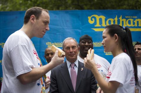 | Les lauréats des concours masculin et féminin, Joey Chestnut et Sonya Thomas, se jaugent du regard sous les yeux du maire de New York, Michael Bloomberg. |