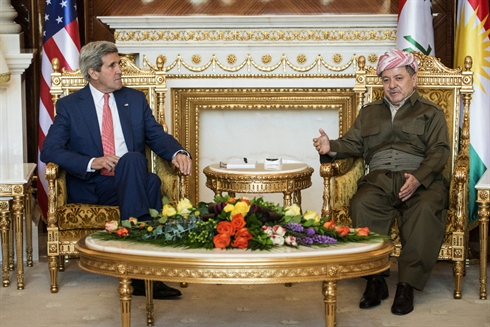 | Le président kurde Massoud Barzani (droite) et le secrétaire d'État américain John Kerry, le 24 juin à Erbil. |