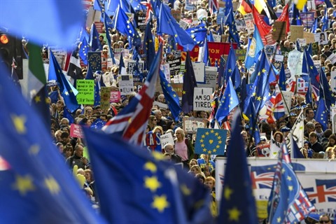 | Des manifestants réclament un second référendum sur le Brexit, à Londres, le 19 octobre. |