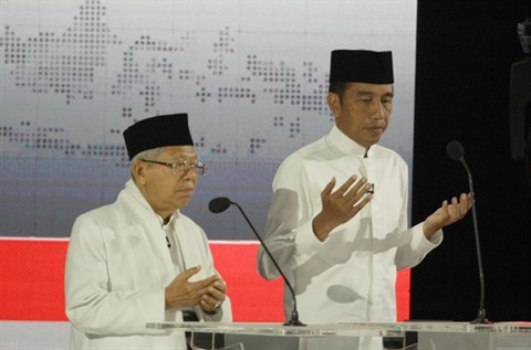 | Le président indonésien sortant Joko Widodo (droite), et son colistier Ma’ruf Amin prononcent un discours à Jakarta, le 13 avril. |