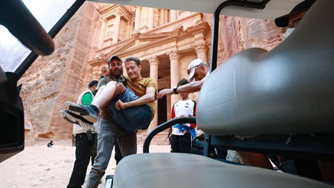 | Un homme aide une personne à mobilité réduite à monter dans une voiture électrique pour visiter la cité de Petra, en Jordanie. |