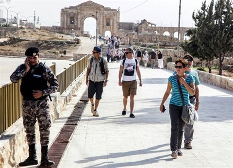 | Des touristes marchent à proximité de la scène d'une attaque au couteau, le 6 novembre dans la cité romaine de Jerash, au nord de la capitale jordanienne Amman. |