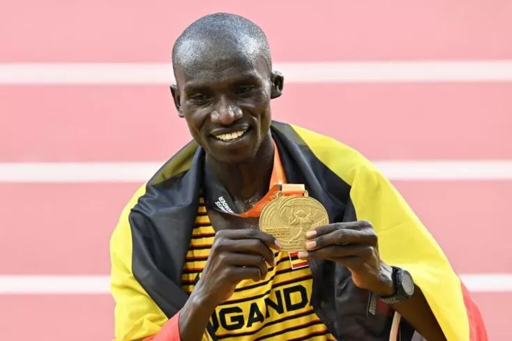 | L'Ougandais Joshua Cheptegei avec sa médaille d'or du 10.000 m aux Mondiaux d'athlétisme le 20 août à Budapest. |