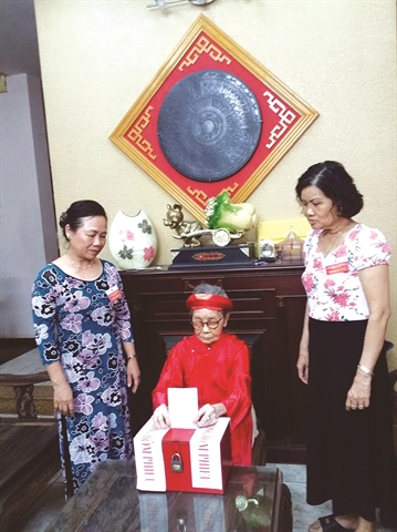 | Les urnes mobiles ont permis à tous, comme ici Nguyên Thi Tiêp, 105 ans, d’exercer leur droit de citoyen sans se déplacer. Tuyêt Mai/VNA/CVN |