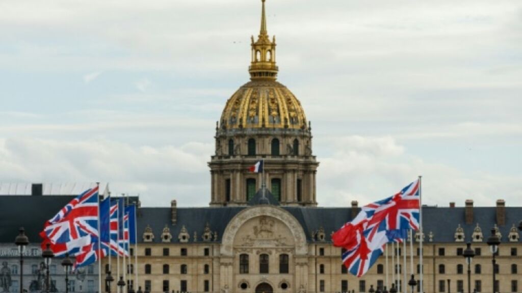 | Des drapeaux nationaux français et britanniques devant l'Hôtel des Invalides dans le centre de Paris le 19 septembre. |