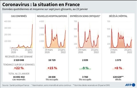 Hors micro-États, la France est le pays d'Europe avec l'incidence la plus élevée, avec 3.733 cas pour 100.000 habitants ces sept derniers jours, selon un comptage de l'AFP. En revanche, avec 2,46 décès pour 100.000 habitants en sept jours, le pays est le 20e en Europe.
