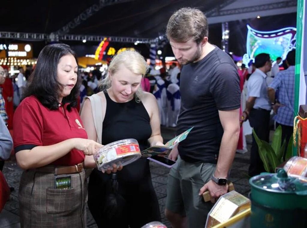 | Des touristes se renseignent sur des produits de nids de salanganes de la province de Ninh Thuân lors de l'événement. |