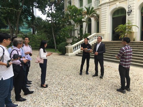 | Vincent Floreani, consul général de France (veste noire) présente aux journalistes des dates clés et des jalons historiques sur la résidence française. |