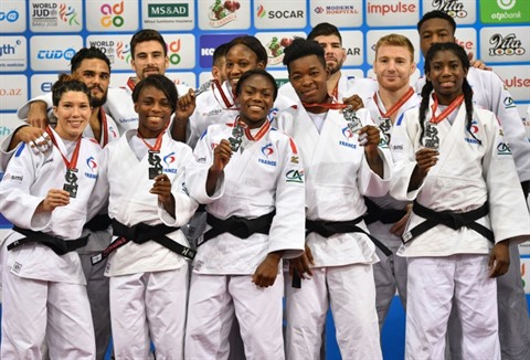 | Les Français, médaillés d'argent lors de l'épreuve par équipes mixtes aux Mondiaux de judo à Bakou, le 27 septembre. |