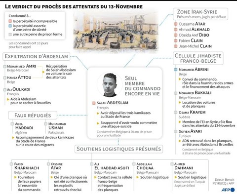 | Récapitulatif des condamnations prononcées contre les vingt accusés jugés au procès des attentats du 13-Novembre à Paris. |