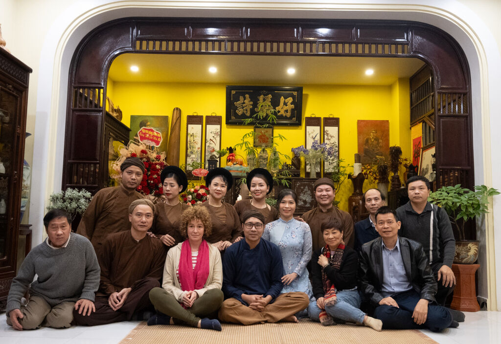 | Julie Bonnafont (1er plan, 3e à gauche) lors d’une rencontre avec des artistes de "hát xâm" (chant des aveugles). |