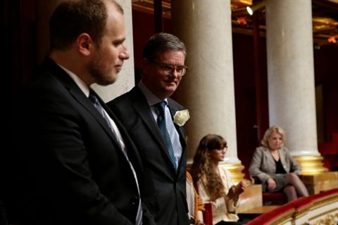 | Julian King (droite) le 21 juin à l'Assemblée nationale à Paris. |