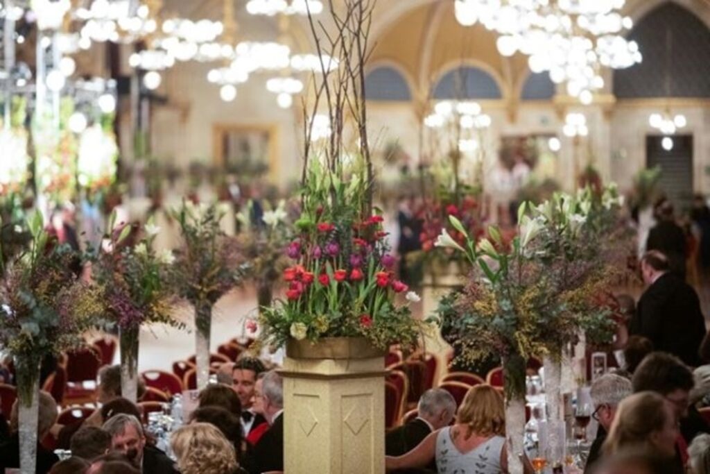 Dans le majestueux bâtiment néo-gothique de la mairie, 2.400 convives se pressent dans un éblouissant décor d'arrangements... composés de 100.000 fleurs.