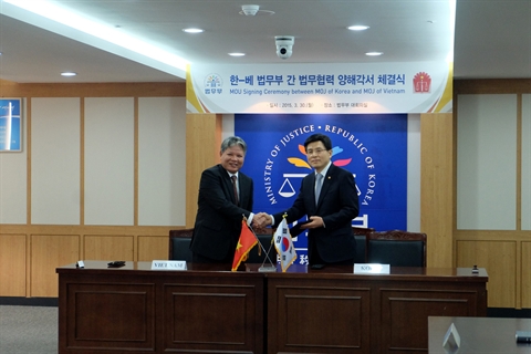 | Rencontre entre le ministre vietnamien de la Justice, Hà Hùng Cuong (gauche), et son homologue sud-coréen Hwang Kyo-ahn, le 28 mars en République de Corée. |