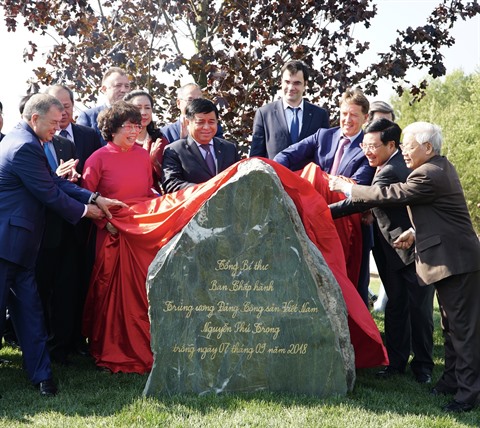 | Lors de la cérémonie de lancement des travaux de l’usine de lait frais de TH à Kalouga, le secrétaire général du PCV, Nguyên Phu Trong (1er à droite), y a planté un érable rouge et posé une pierre de souvenir. |
