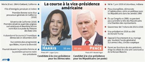 | Dates clés dans la vie du vice-président sortant des États-Unis Mike Pence et de la candidate démocrate à la vice-présidence Kamala Harris. |