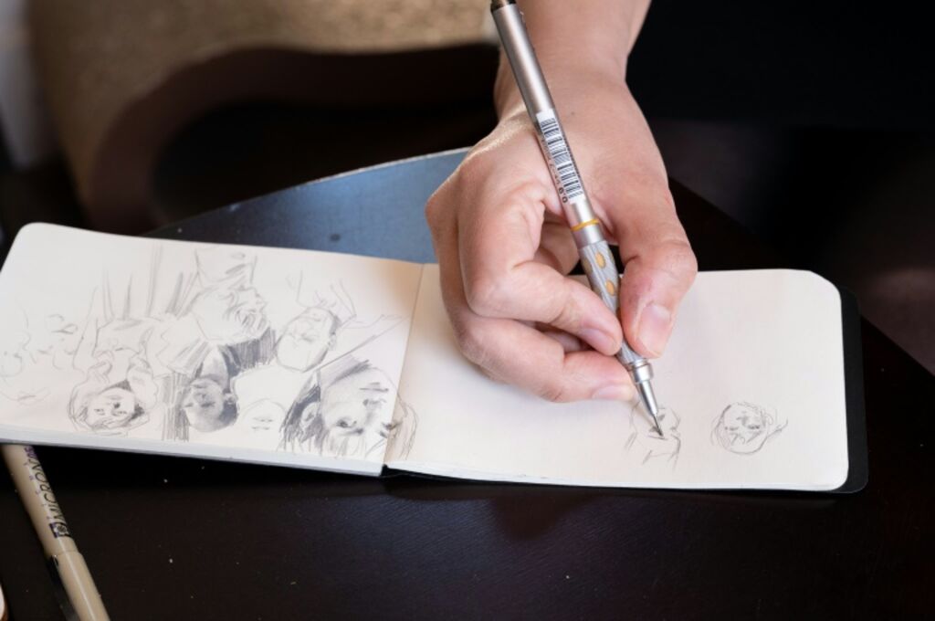 | Karla Ortiz réalise des esquisses pendant une interview chez elle le 8 mars 2023 à San Francisco. |
