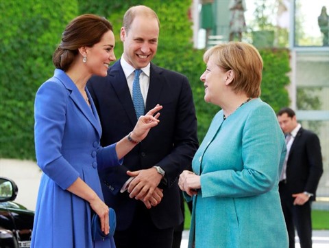 Le prince William et son épouse Kate accueillis par la chancelière allemande Angela Merkel (droite) à leur arrivée à Berlin, le 19 juillet. Photo : AFP/VNA/CVN |