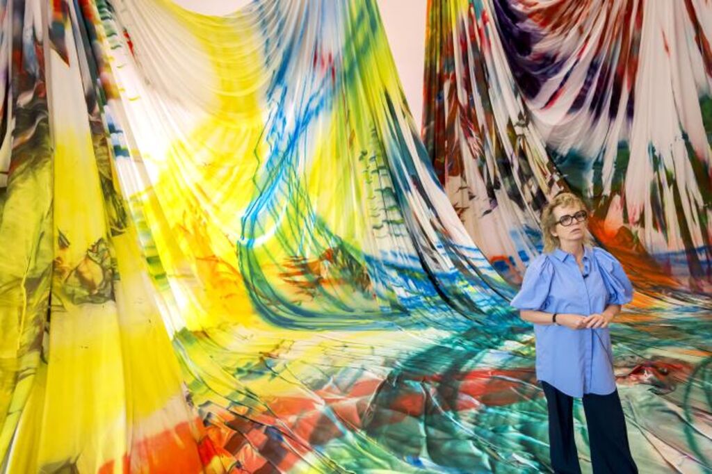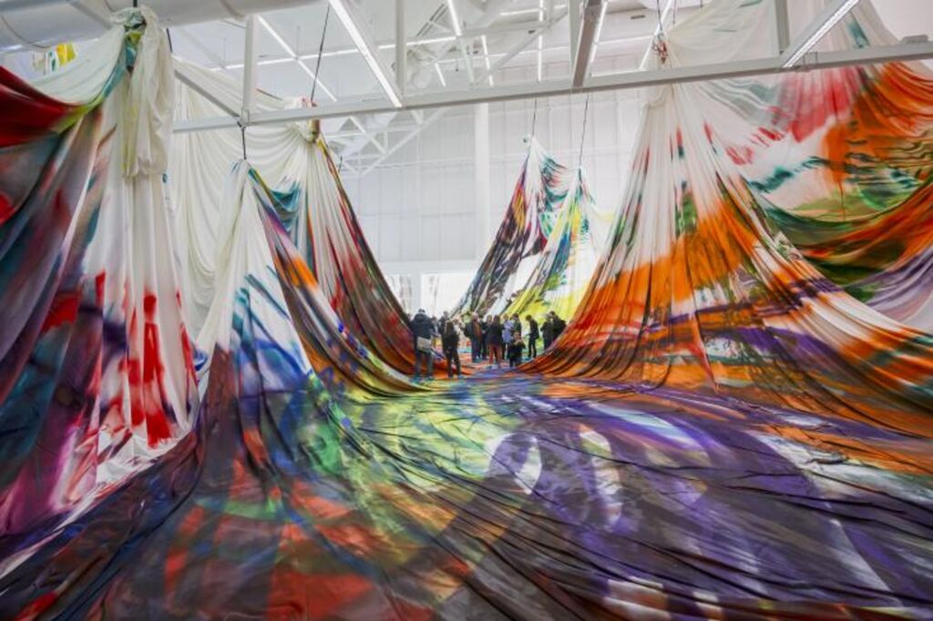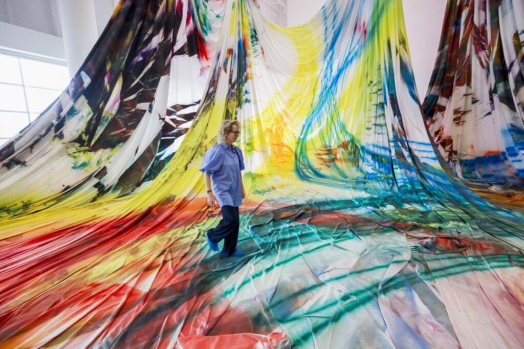 Katharina Grosse fait dans la démesure. Son oeuvre, déjà montrée en partie à Sydney en 2018, pèse près de cinq tonnes de tissu, sans compter les litres de peinture pulvérisée.