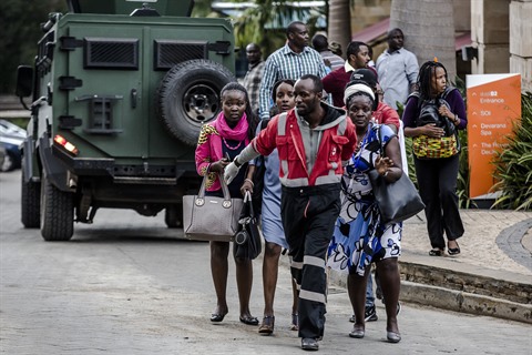 | Évacuation des habitants du site de l'explosion à un complexe hôtelier et de bureaux, le 15 janvier 2019 à Nairobi. |