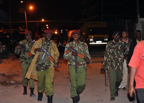 | Des paramilitaires kényans arrivent sur le site de l'explosion à Nairobi, le 31 ma |