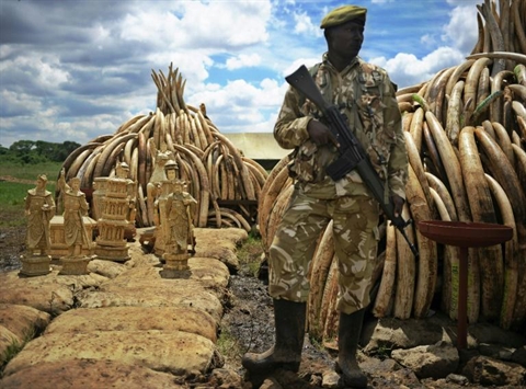 | Des ivoires stockées le 27 avril dans le Parc national de Nairobi, prêtes à être brûlées |