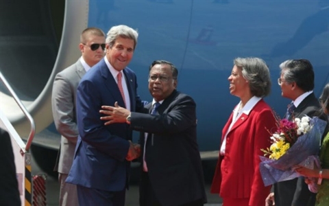 | Le secrétaire d'État américain John Kerry (1er plan à gauche) serre la main à son homologue bangladais Mahmood Ali, le 29 août à l'aéroport de Dacca. |
