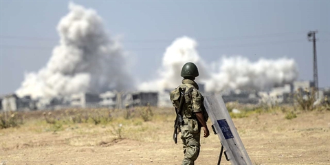 | Un militaire combattant contre l'État islamique pour garde la ville syrienne de Kobané. |