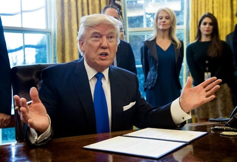 | Le président Donald Trump a signé une série de décrets le 24 janvier à Washington DC ouvrant la voie à la construction d'un oléoduc controversé porté par la compagnie Energy Transfer Partners dans le Dakota du Nord, ainsi que celui de Keystone XL. |