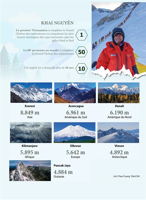 D’après la liste du site https://explorersgrandslam.com, Khai Nguyên est la 50e personne au monde à relever ce défi. Il a conquis l’Everest, l’Aconcagua, le Denali, le Kilimandjaro, l’Elbrouz, le Vinson, le Puncak Jaya. Une quête qui lui a demandé plus de dix ans.