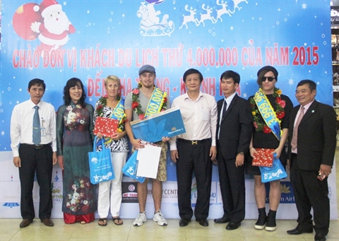| Le Russe Vlasenko Stanislav (4e à gauche) est le quatre millionième touriste de l’année 2015 à atterrir à l'aéroport de Cam Ranh, province de Khanh Hoà (Centre). |