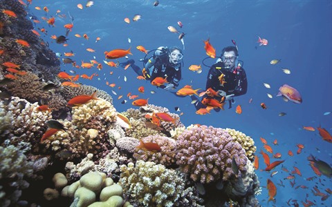 | Des touristes découvrent un récif corallien multicolore et des poissons au fond de la mer à Nha Trang. |