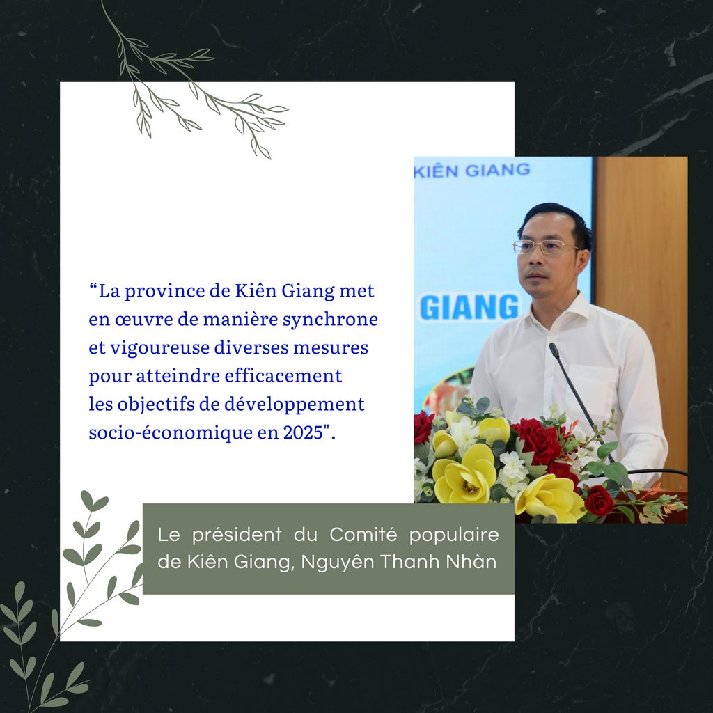 En 2025, Kiên Giang accélérera l’accomplissement des objectifs et des tâches fixés par la Résolution du XIᵉ Congrès du Comité provincial du Parti, organisera avec succès les congrès du Parti à tous les niveaux pour le mandat 2025-2030 et procédera à une réorganisation ainsi qu’à une rationalisation de l’appareil administratif afin d’en améliorer l’efficacité et l’efficience. Le Comité provincial du Parti renforcera la consolidation et le développement du Parti et du système politique, tout en se concentrant sur l’exploitation maximale des atouts de la province, sur la résolution des difficultés et obstacles, afin de promouvoir une forte croissance économique et d’améliorer continuellement les conditions de vie de la population.