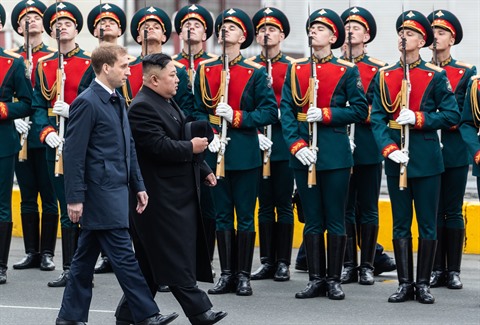 | Le président de la RPDC, Kim Jong Un (en manteau noir), à la gare de Vladivostok, le 24 avril en Russie. |