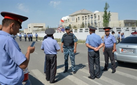 | Des policiers kirghizs le 30 août devant l'ambassade de Chine à Bichkek. |