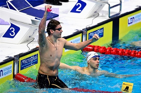 | Le Russe Kliment Kolesnikov vient d'exploser le record du monde de 50m dos aux Championnats d'Europe de natation à Budapest, le 17 mai. |