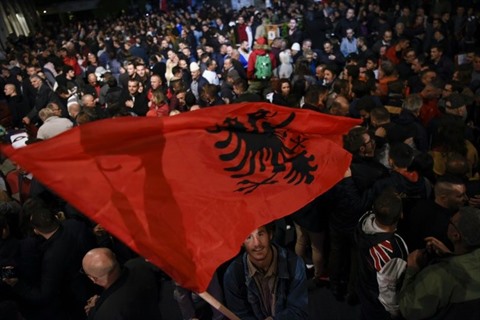 | Des supporters d'Albin Kurti brandissent un drapeau du Kosovo lors d'un rassemblement à Pristina, le 4 octobre 2019. |