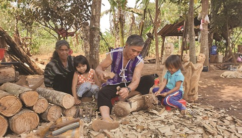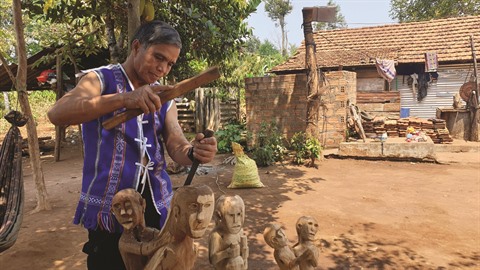 | Ksor Ksôh sculpte avec passion des statues en bois. |