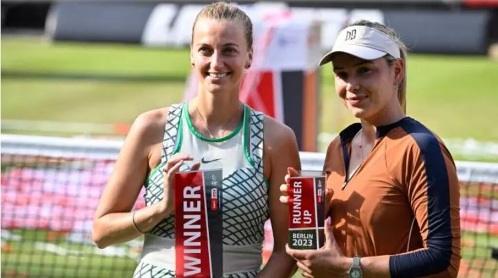 | La Tchèque Petra Kvitova après sa victoire en finale du tournoi WTA 500 de Herlin contre la Croate Donna Vekic (droite), le 25 juin. |