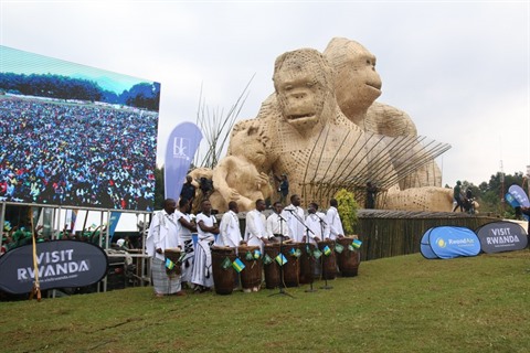 | Des artistes se produisent lors d'une cérémonie de "baptême" des bébés gorilles dans le district de Musanze, dans la province du Nord du Rwanda. |