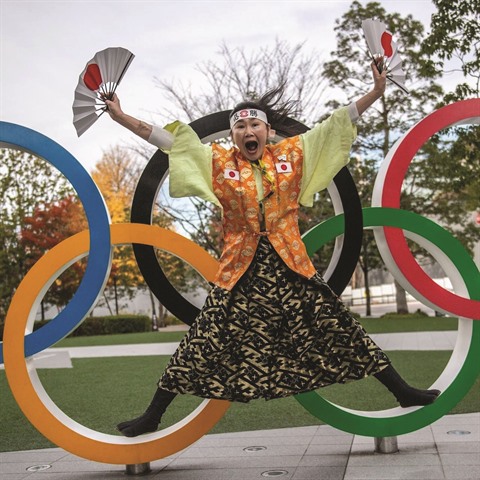 | La fan des Jeux olympiques, Kyoko Ishikawa, pose devant les anneaux installés devant le nouveau stade olympique national à Tokyo. |