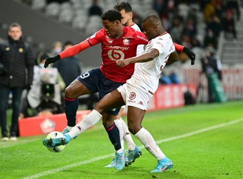 | Le buteur lillois Jonathan David (maillot rouge) a été muselé par la défense de Metz, à l'instar de Matthieu Udol à Villeneuve-d'Ascq, le 18 février. |