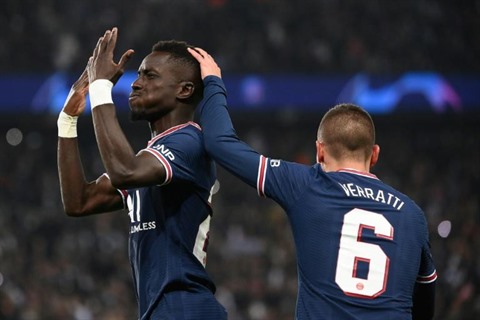 | Le milieu du Paris SG Marco Verratti félicite son coéquipier Idrissa Gueye après son but contre Manchester City, le 28 septembre en phase de poules de Ligue des champions. |