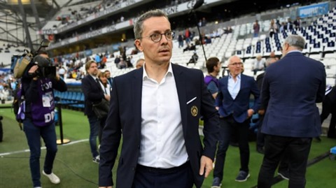 | Le président de l'Olympique de Marseille, Jacques-Henri Eyraud, avant le match OM - Montpellier au stade Vélodrome, le 24 mai 2019. |
