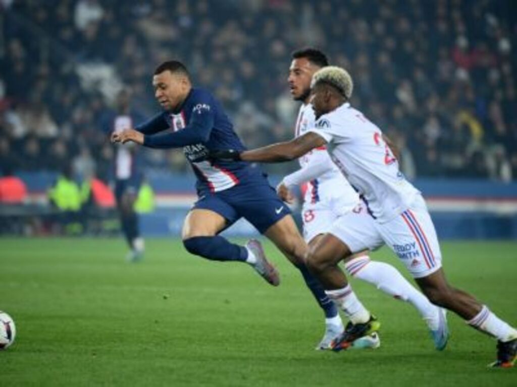 | L'attaquant du PSG, Kylian Mbappé, devance le Lyonnais Thiago Mendes, le 2 avril au Parc des Princes. |